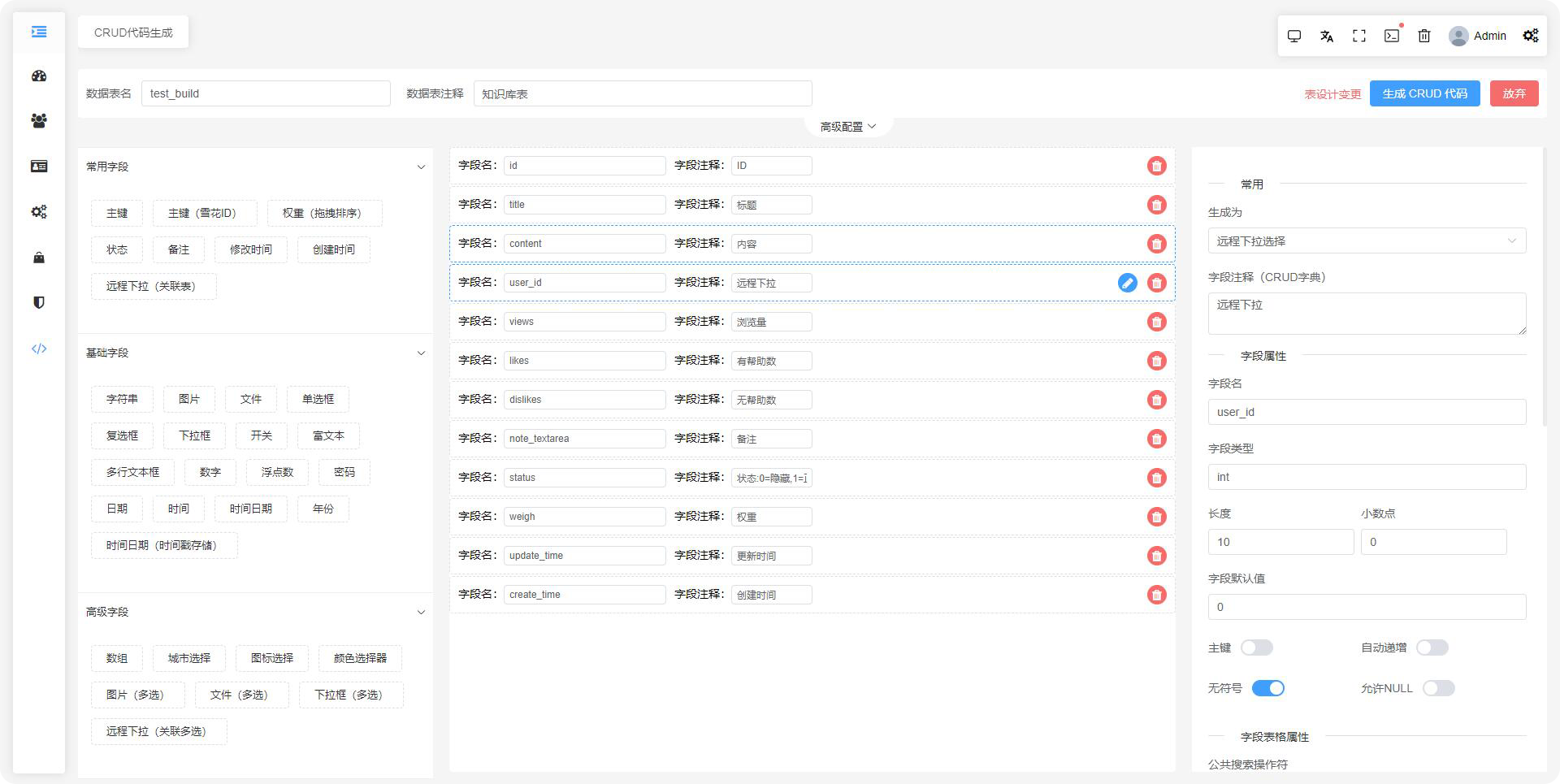 CRUD是增加(Create)、检索(Retrieve)、更新(Update)和删除(Delete)几个单词的首字母简写,BuildAdmin实现了可视化生成CRUD代码的功能,请参考下方介绍使用。